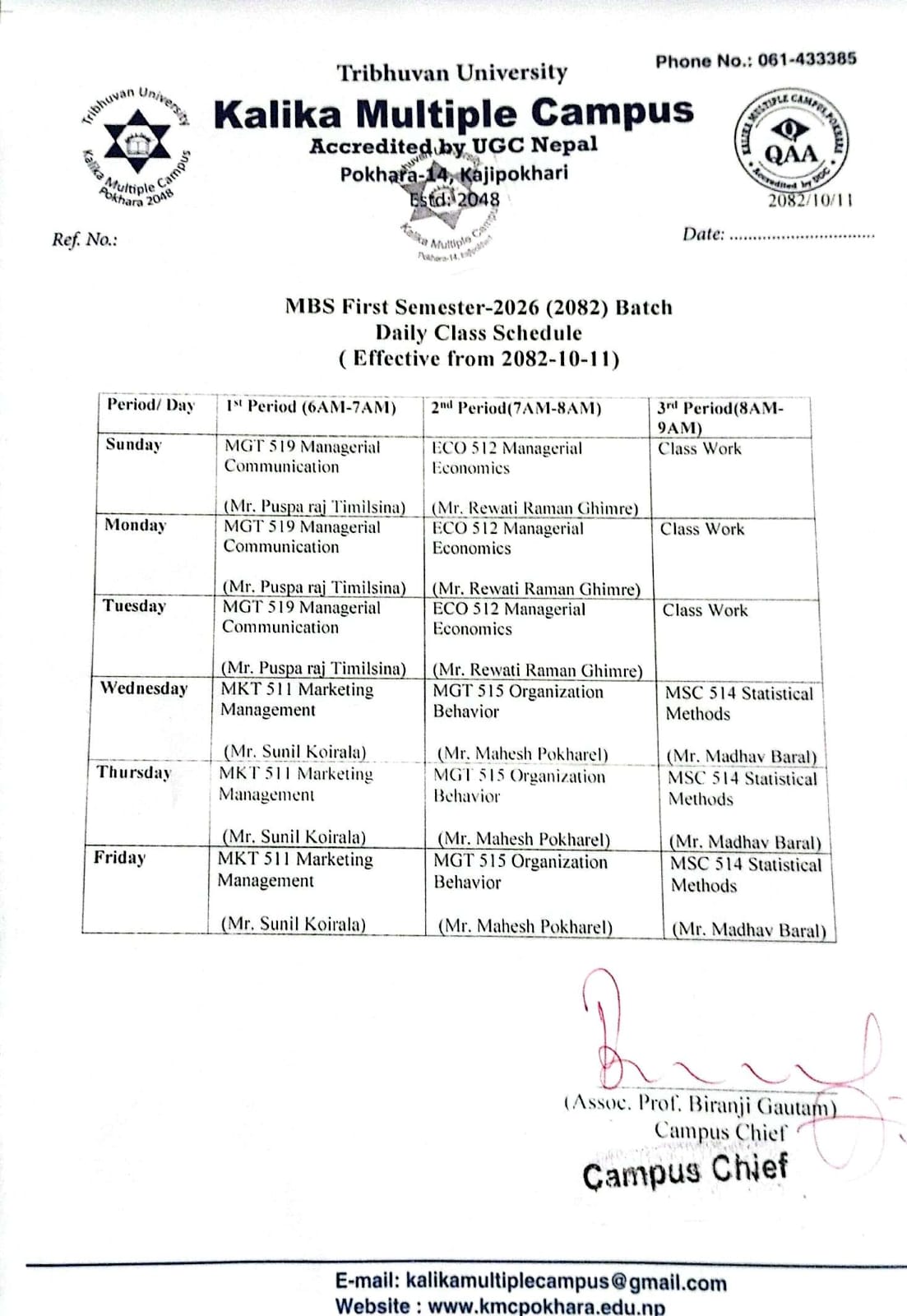 Kalika Multiple Campus (KMC), a QAA certified community campus, was established by the collective effort of local academics and social activists in 1990 (2048 B.S.). It is a nonprofit autonomous campus, affiliated to Tribhuvan University (TU). It is a campus with a proud heritage, excellent programs and distinguished faculty. From its establishment, the campus has been preparing students to confront the global challenges.