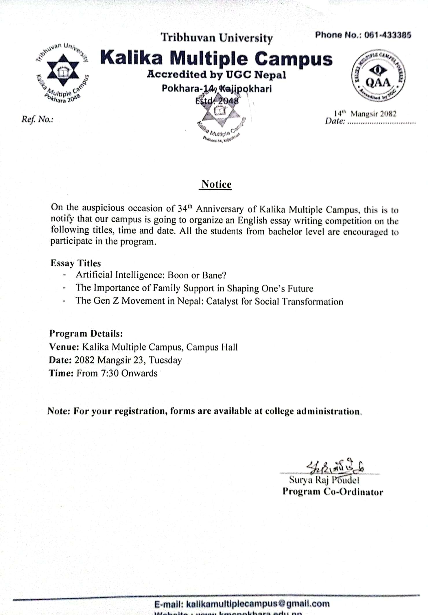 Kalika Multiple Campus (KMC) Pokhara is a premier educational institution committed to providing quality education with modern facilities and experienced faculty. We focus on holistic development of students through academic excellence and extracurricular activities.