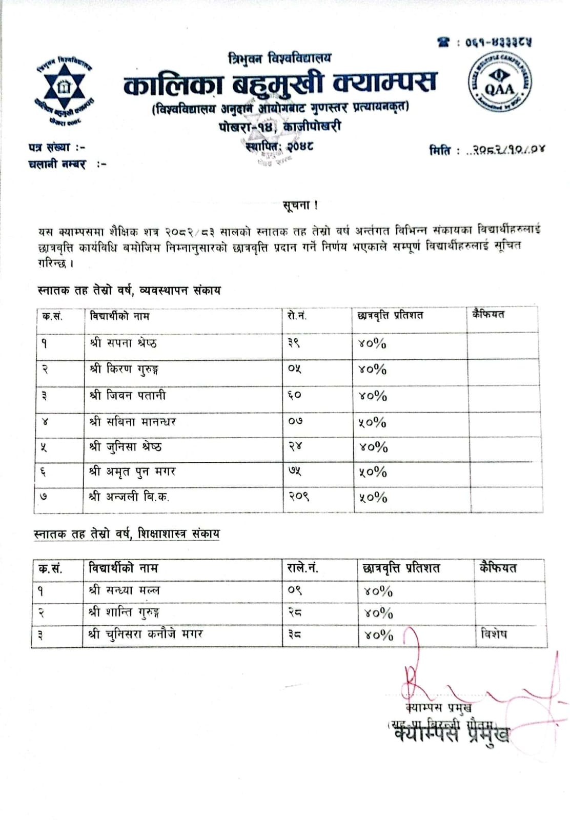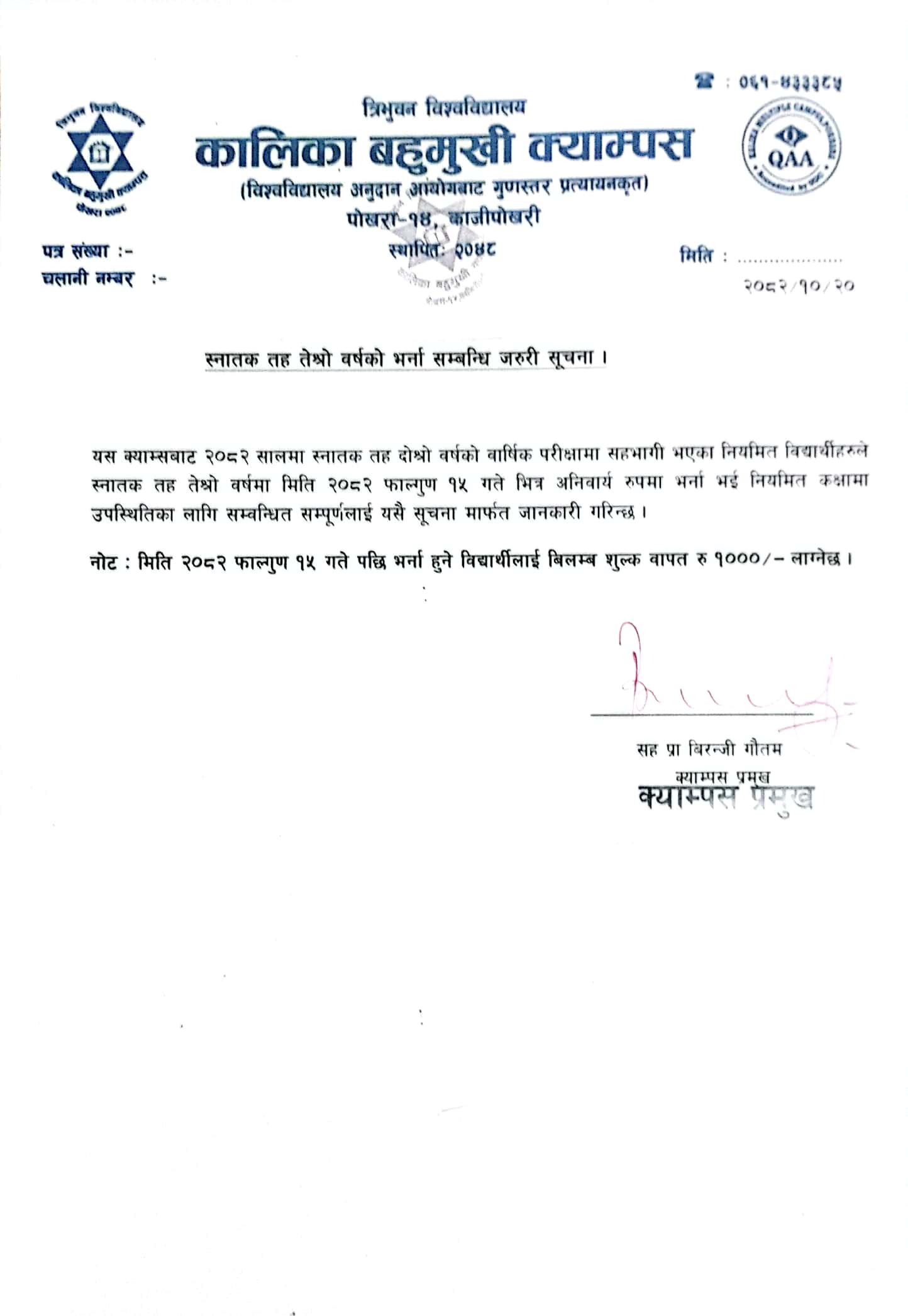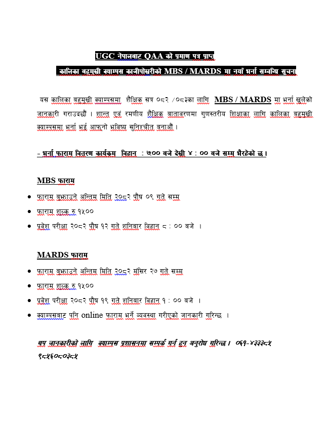 Kalika Multiple Campus (KMC), a QAA certified community campus, was established by the collective effort of local academics and social activists in 1990 (2048 B.S.). It is a nonprofit autonomous campus, affiliated to Tribhuvan University (TU). It is a campus with a proud heritage, excellent programs and distinguished faculty. From its establishment, the campus has been preparing students to confront the global challenges.