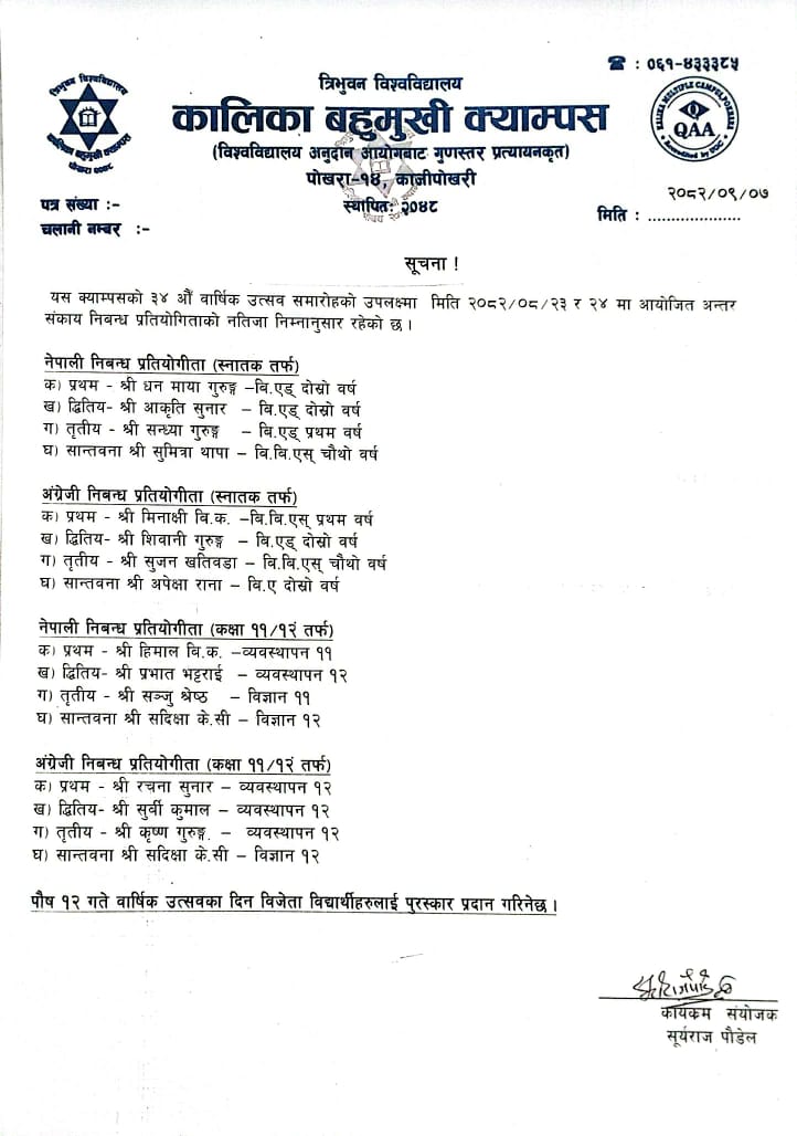 "FACULTY: MANAGEMENT LEVEL: BBS II YEAR I am glad to see some strong initiatives for QAA Certification by our campus. QAA accreditation is necessary for every Higher Educational Institution in Nepal because it enables the campus to promote its overall quality to meet global standards. We are happy to be part of various campus committees that work for campus reform. Let’s work hand in hand to make the QAA mission a success. Highly recommended for all students seeking quality education."